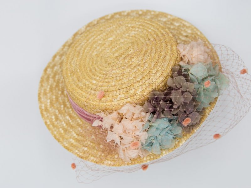 Esta pamela es de mis favoritas. Tiene una forma que recuerda líneas orientales, pero con mucha elegancia. En cuanto la tuve en mis manos quise darle un estilo romántico y decidí que el tul fuera el protagonista.