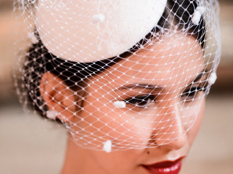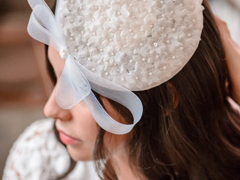 El tul es la sujeción de este sombrero. Suave y cómodo, puede atarse por delante en un lateral o por detrás de las orejas. En ambos casos queda muy bonito exagerar el lazo y su transparencia.